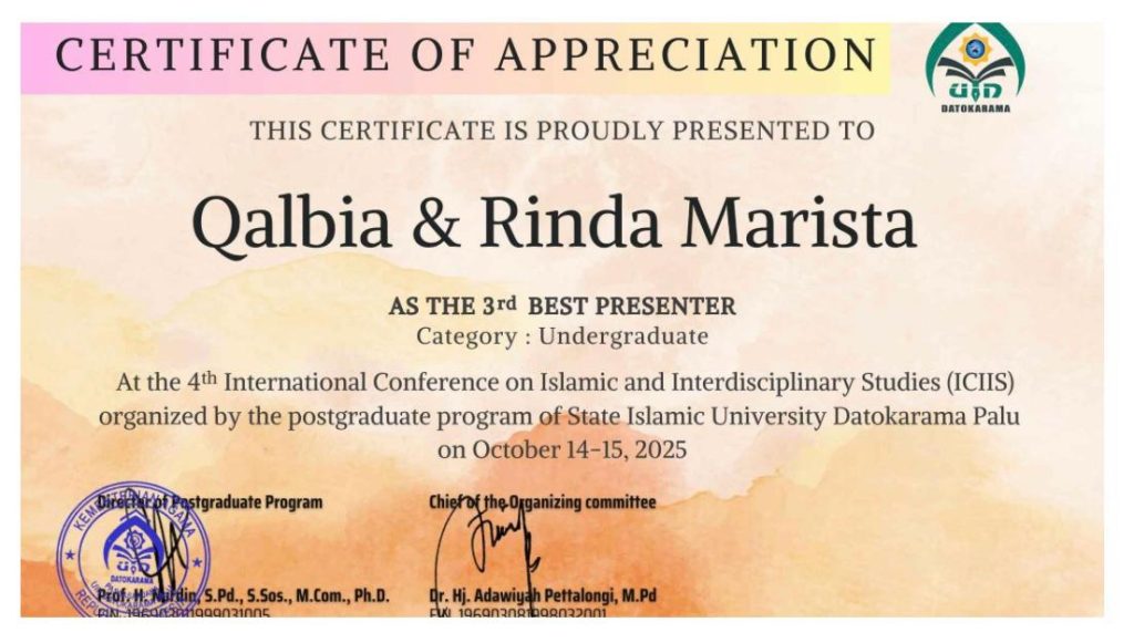 Setelah melalui proses review dan penilaian yang objektif dan ketat oleh tim panelis, Pascasarjana UIN Datokarama Palu menetapkan penerima penghargaan Best Presenter pada kategori Undergraduate. Prestasi tersebut berhasil diraih oleh Qalbia dan Rinda Marista, mahasiswa semester VII Program Studi Perbandingan Mazhab (PM), Fakultas Syariah UIN Datokarama Palu.